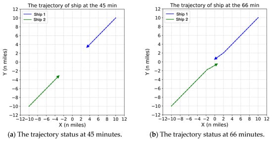 As shown in Figure 7, the distributed ship collision-avoidance framework consists of two phases: the control phase and the search phase [29]. During the control phase, if no conflicting ships are detected, the ship proceeds to the next planned position. However, if other ships posing a collision risk are present within the detection range, the ship transitions to the search phase. In this search phase, the involved ships exchange key navigational information, including updates on collision-avoidance cost evaluations and intended heading adjustment. They then collaboratively execute a distributed collision-avoidance algorithm to generate collision-free navigation strategies and update their respective route points accordingly. These two phases alternate continuously throughout the voyage until all ships safely reach their destinations. A complete alternation of the two phases is defined as a “time step,” for which the duration can be dynamically adjusted according to factors such as the encounter type, relative position, and collision risk urgency. In emergency situations, a shorter time step can be adopted to enhance system responsiveness and enable rapid collision avoidance. For intelligent ships equipped with high-performance communication and autonomous decision-making systems, reducing the time step can further improve coordination efficiency. Conversely, traffic management systems or centralized scheduling scenarios may favor longer time steps to maintain decision stability and foresight. In order to achieve equilibrium among general collision-avoidance responsiveness, communication frequency, and system stability, the temporal resolution in this study is uniformly set to 3 min. Accordingly, each ship reassesses its course adjustments every three minutes and executes them at the next time step.