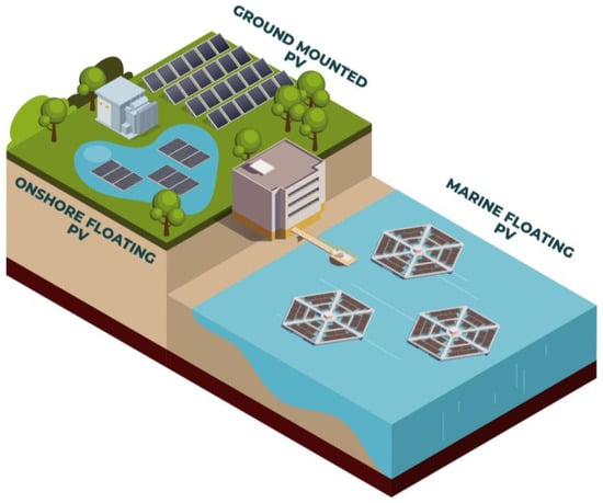 Floating solar photovoltaic systems (FPV) represent an ecological and versatile solution as they are located on water surfaces and have a high potential to exploit available water resources [5,6,7]. FPV technology can be categorized into two broad classes, onshore FPV and marine FPV, each of which is adapted to specific environmental conditions and water body characteristics [8,9].