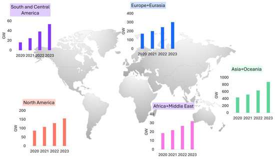 The global PV capacity added approximately 345 GW by the end of 2023, bringing the total installed capacity to approximately 1418 GW. This suggests a market increase of approximately 73% compared to 2022, when nearly 199 GW was installed. The results shown in Figure 2 were produced using statistical data obtained from IRENA, which only included data for the 2020–2023 period [14]. China is the current leader in the global PV market [15], with 610 GW installed, of which 217 GW was installed in 2023. This is due to its dominance in both production and installation. Nevertheless, the market for PV systems is becoming more competitive, which enables them to be deployed independently of subsidy programs. Consequently, an increasing number of countries are installing PV systems on a significant scale. By the end of 2023, experts estimated the FVP market to be 5.9 GW.