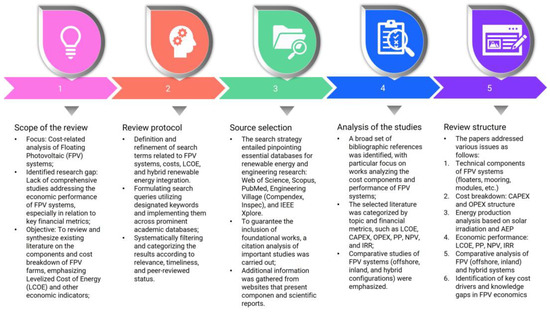 The costs and components of FPV were reviewed. Methodical research revealed relevant academic papers. In this step, we learned about FPV architecture, nature, projects, how they integrate renewable energy, and whether other renewable energies can be used together. The search method ensures scientific integrity and relevant research.