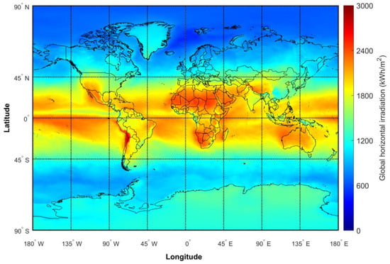Global solar irradiation distribution map.
