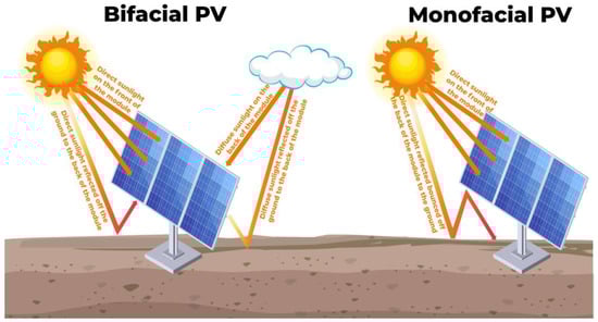 Figure 6 shows monofacial and bifacial solar modules. The monofacial module only gathers solar energy from the front; hence, it only works on the sun-exposed side. In contrast, the bifacial module collects energy reflected from the ground or other surfaces using solar cells on both sides. This makes the bifacial module more efficient. However, bifacial solar modules may use the albedo effect to boost output, as illustrated in [131], which raised production by 12.4%. However, PVsyst simulations may limit the study’s real-world utility. A combination of a hybrid mathematical Perez model and a 2D view factor model effectively represented the albedo effect, but real-life factors such as weather, water clarity, and seasonal changes might affect how well bifacial PV modules work more than the study indicates. Reference [132] compared monofacial and bifacial modules on a white surface. The yield increased by 15–17%, while moss and mold growth caused a 10% drop after one year. Continuing in this vein, the authors of reference [133] assessed the feasibility of situating the bifacial module on CWS and PFS. The research found that the PFS increased energy production by 4.3–4.86% and cooling system performance by 3.19% under different irradiation levels. For floating solar module farms, glass–glass bifacial solar modules are best [134,135]