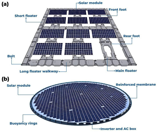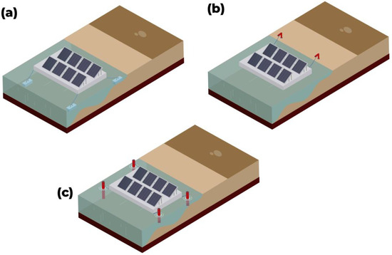 - Superficial structures (Figure 7b): These partly submerged systems use water’s cooling properties to keep modules cold. Lowering module temperatures improves efficiency and protects against wind and wave damage [151,152]. Two types of superficial structures exist [153]: