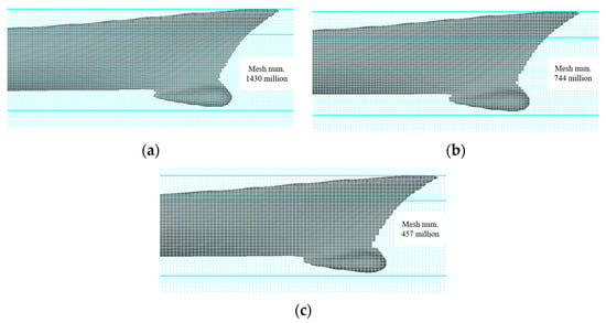 In this work, dynamic motion of the ship is directly simulated, namely, the ship sails in the pre-set calculation domain. For the capture of flow details around the ship hull, a refinement block, with X [−0.75 Loa, 3.0 Loa], Y [0, 0.5 Loa], Z [−0.07 Loa, 0.035 Loa], is set, and a gradient grid size is applied to the far-field regions. In the grid convergence study, the mesh density of the refinement block is set with a growth ratio of . The mesh details under different mesh resolutions are shown in Figure 2.