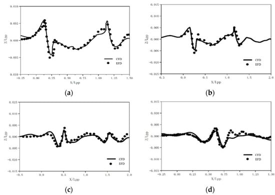 Comparisons between the EFD data and CFD simulations are listed in Table 4, where EFD is the acronym of experimental fluid dynamics, and CFD is the acronym of computational fluid dynamics. It is found that the finest mesh indicates better accuracy on the ship resistance, while the moderate mesh density also presents satisfactory results with only half the amount of the fine mesh condition. Moreover, with the mesh density S2, the wave elevation on the free-surface complies with the EFD observations, as shown in Figure 3.