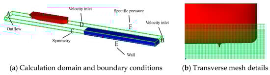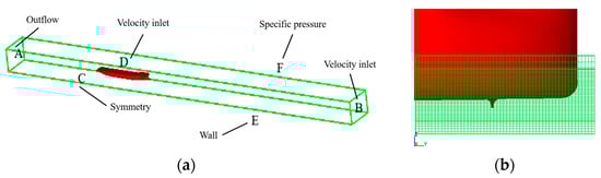 Calculation domain and mesh details around ship hull under open shallow water. (a) Calculation domain and boundary conditions. (b) Transverse mesh details.