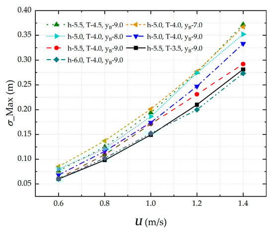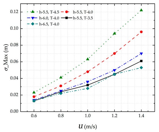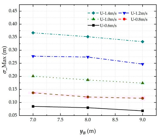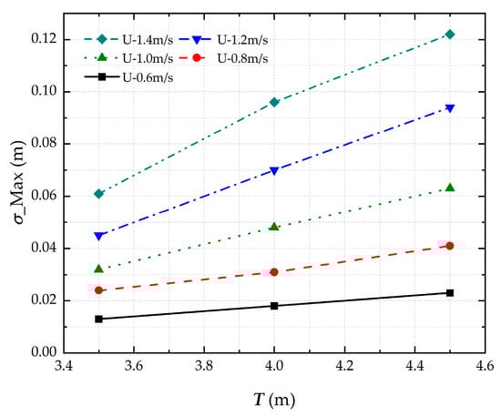 Figure 11 presents the water depth- and draft-dependent squat characteristics of the cargo ship under varying speed conditions. The results demonstrate three key findings as follows: (1) squat magnitude increases proportionally with ship velocity; (2) a strong negative correlation exists between water depth and squat; and (3) squat shows a positive correlation with ship draft. These relationships confirm that reduced under-keel clearance (shallower water depth relative to draft) leads to significantly greater ship sinkage. However, despite meter-scale variations in ship draft, the resulting squat remains constrained to centimeter-level magnitudes, indicating that while the relative effects are substantial, the absolute sinkage values remain operationally manageable.