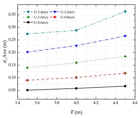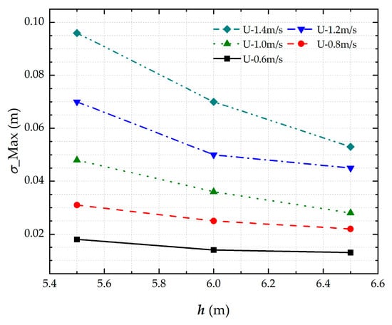 Figure 6 presents the squat characteristics of the cargo ship under varying speed conditions at different water depths. The results show that for a fixed ship draft (T = 4.0 m), squat decreases as water depth increases, with water depth-to-draft ratios ranging from 1.375 to 1.625. This demonstrates that under open shallow water conditions, water depth variations induce centimeter-level sinkage magnitude changes for the 5000-tonnage inland cargo ship.