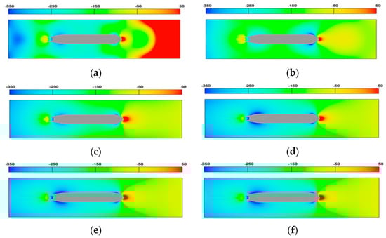 Pressure distribution on free surface. (a) t = 10 s. (b) t = 20 s. (c) t = 30 s. (d) t = 40 s. (e) t = 50 s. (f) t = 60 s.