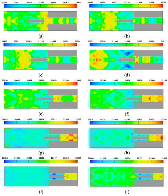 Figure 13a,b demonstrates that as the hull approaches the lock chamber entrance, the surrounding flow field exhibits patterns similar to the initial 20 s under open shallow water conditions, though with distinct fluid accumulation within the chamber. The hydrodynamic evolution during entry reveals three key stages as follows: (1) during initial bow entry (Figure 13c,d), a significant pressure increase occurs that persists until approximately 2/3 Loa of the hull enters; (2) subsequent stern entry results in a moderate pressure decrease while maintaining elevated levels; and (3) upon complete entry (Figure 13i,j), the pressure distribution stabilizes with sustained high pressure at the bow and gradual equilibration to initial channel pressure near the stern. These observations highlight the dynamic pressure variations during the entire lock entry process.