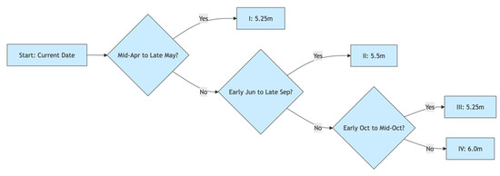 The minimum lock sill water depth (hL) is highly correlated to the upper and lower pool levels. In accordance with the water level fluctuation pattern, the annual operation of the Three Gorges Ship Lock is categorized into four distinct periods, the decision flow is illustrated in Figure 14.