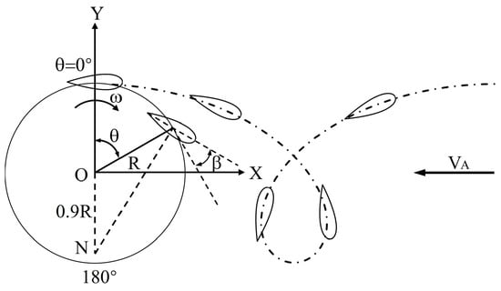 The Voith–Schneider Propeller (VSP) typically consists of 4–6 vertically mounted blades. While revolving uniformly around the center of the propeller disk, the blades simultaneously rotate around their own axes at variable speeds. Similar to the tail fin oscillation of fish, VSP blades undergo rapid flipping motion near a revolution angle of 180 degrees. As shown in Figure 1, point O is the revolution center of the propeller disk, R is the revolution radius, β is the self-rotation angle of the blade, θ is the revolution angle of the blade, and ω is the revolution angular velocity. As the vessel advances, the trajectory of the blades follows a cycloidal path. During rotation, the normal lines of all blade chord lengths consistently intersect at a single point [], known as the eccentric point N. The ratio of the distance from the eccentric point to the revolution center to the radius R is defined as the eccentricity, denoted as e = /R.