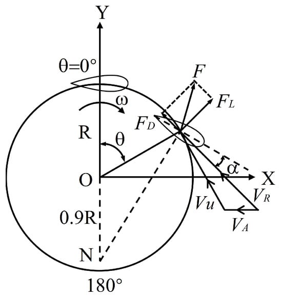 The Voith–Schneider Propeller (VSP) generates thrust through the interaction between its blades and the water flow. The velocity and force vector distributions acting on a blade are shown in Figure 3. VA is the inflow velocity, VU is the circumferential velocity of the propeller disk, and VR is the resultant velocity. FD is the drag force acting on the blade, FL is the lift force generated by the blade, and F is the resultant force. The angle of attack α is the angle between the blade chord line and the resultant velocity. Its relationship with the blade revolution angle θ is as shown in Equation (3). By moving the position of the eccentric point N, the magnitude of the angle of attack α can be altered, thereby changing the magnitude and direction of the thrust.