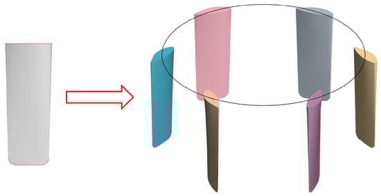 Over the past two decades, Computational Fluid Dynamics (CFD) methods based on viscous fluid mechanics have rapidly developed and have been progressively applied to the hydrodynamic assessment of Voith–Schneider Propellers (VSPs). This paper employs STAR-CCM+ 2022.1.1 software for CFD simulations, considering the fluid as viscous and incompressible, and solves the RANS equations using the SST k-ω model. The Report 2983 published by Ficken and Dickerson in 1969 is widely used for the validation of numerical models. Therefore, this study adopts the same six-blade VSP model as described in the report. The blades feature varying airfoil sections along the span and a slightly tapered rectangular section, with the self-rotation center located at the mid-chord point, as shown in Figure 4. Detailed parameters are listed in Table 1.