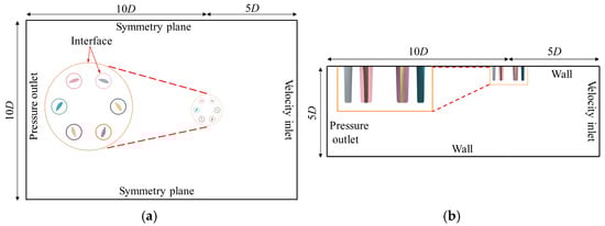 In this paper, the sliding mesh technique and UDF (User-Defined Function) control are employed to simulate the uniform revolution and variable-speed self-rotation motions of the VSP blades. As shown in Figure 5a, the entire computational domain is divided into the self-rotation domain, the revolution domain, and the stationary domain. Data exchange between these different domains is achieved by setting interfaces. To ensure fully developed flow within the computational domain, the propeller disk diameter D is used as the characteristic length. The length in the inflow direction is set to 5D, and the length in the outflow direction is set to 10D. The width and height of the computational domain are set to 10D and 5D, respectively. To simulate the real test environment where the VSP blades extend from the ship bottom, as shown in Figure 5b, the top surface of the blades is positioned flush with the top surface of the computational domain. The top and bottom surfaces of the computational domain are set as wall boundaries. The inflow boundary is set as a velocity inlet, the outflow boundary is set as a pressure outlet, and the side boundaries are set as symmetry planes.