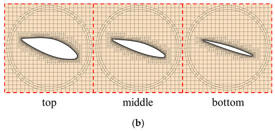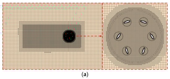 Unstructured grids are used for meshing the computational domain, with a base size set to 3 mm. To ensure that the thickness of the first layer of wall-adjacent grid cells yields Y+ < 1, 10 layers of prism layers are applied on the blade surfaces, with a prism layer growth ratio set to 1.5. As shown in Figure 6a, the grids undergo gradual refinement starting from the far field. To improve the accuracy of simulating the internal flow field of the Voith–Schneider Propeller (VSP), the grid cell size within both the revolution domain and the self-rotation domain is set identically. Figure 6b shows the grid distribution in the self-rotation domain at different positions along the blade span direction.