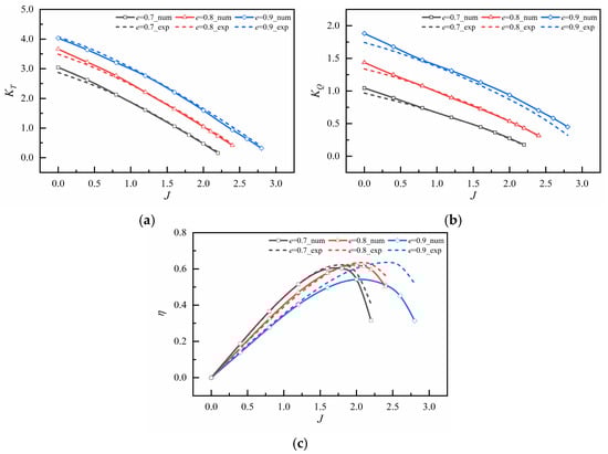 Hydrodynamic coefficient curves under different advance coefficients: (a) KT, (b) KQ, and (c) η.