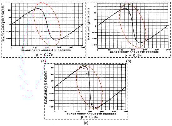 Analysis indicates that the alteration in the Blade Steering Curve under high eccentricity may be the primary reason for this large error between the calculation and experiment. Nakonechny [] mentioned in their report that the blade self-rotation angles were monitored during the tests. Figure 8 displays the measured blade motion trajectories of the VSP under eccentricity conditions of 0.7, 0.8, and 0.9. It can be seen that angle monitoring was performed every 15 degrees during the experiment. For the e = 0.7 and e = 0.8 conditions, the actual self-rotation angles of the VSP exhibit high coincidence with the theoretical curve. However, under the e = 0.9 condition, the VSP blades did not move according to the prescribed “normal intersection principle” when passing near the eccentric point. Limited by the executability of the cam control mechanism, multiple monitored self-rotation angle values deviated from the theoretical curve within the revolution angle range of 120 to 240 degrees. This may lead to changes in the hydrodynamic performance of the VSP, the specific effects of which will be explored in subsequent sections.
