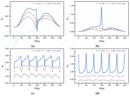 Variation in the hydrodynamics of the VSP with the revolution angle (J = 1.6): (a) KT of single blade, (b) KQ of single blade, (c) KT of propeller, and (d) KQ of propeller.