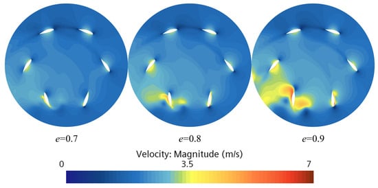 A comparison of the hydrodynamic calculation results with experimental results for the Voith–Schneider Propeller (VSP) under eccentricity conditions of 0.7, 0.8, and 0.9 is shown in Figure 7. It can be observed that both the thrust coefficient (KT) and torque coefficient (KQ) of the VSP increase with eccentricity but decrease with an increasing advance coefficient (J). Furthermore, under low and medium eccentricities (e = 0.7, e = 0.8), all hydrodynamic calculation results for the VSP agree well with the experimental data. However, at high eccentricity (e = 0.9), a significant discrepancy exists between the calculated efficiency and the experimental results.