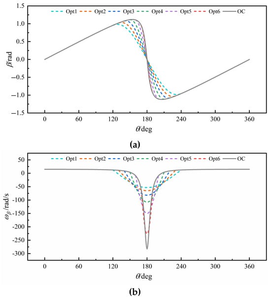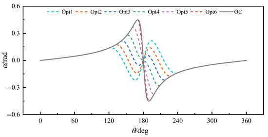 The revolution angle range from 120 to 240 degrees was designated as the target optimization interval. Based on the original Blade Steering Curve (OC) adhering to the “normal intersection principle” under high eccentricity, with the self-rotation angles and angular velocities at the start and end positions of the interval serving as constraint conditions, a sinusoidal function was utilized for local fitting and replacement of the blade motion curve. The optimized equations for the blade self-rotation angle and angular velocity are given by Equations (10) and (11), respectively. By progressively narrowing the fitting interval to approximate the original curve, as shown in Figure 12, six sets of optimized Blade Steering Curves and their corresponding angular velocity curves were obtained using an optimization interval length of 20 degrees. Table 4 lists the specific parameters of the different optimized curves, including the fitting interval length, self-rotation angle amplitude, and self-rotation angular velocity amplitude. For Opt1–Opt4, the fitting intervals encompassed the revolution angle corresponding to the peak value of the original curve. The optimized curves exhibited reduced peak values due to the fitting equations, resulting in significant deviations from the original curve. In contrast, the fitting intervals for Opt5 and Opt6 did not include the revolution angle corresponding to the original curve’s peak value, yielding identical peak values in the optimized curves. Consequently, these optimized curves remained relatively close to the original curve.