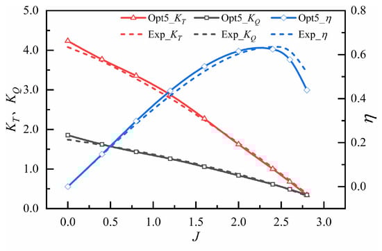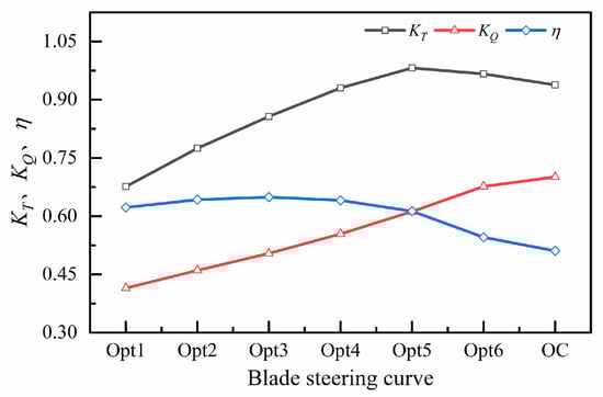 The hydrodynamic calculation results for the different optimized curves at the advance coefficient (J = 2.4) corresponding to the maximum efficiency point in the experiments are shown in Figure 13. It can be observed that changes in the Blade Steering Curve significantly impact the hydrodynamic performance of the Voith–Schneider Propeller (VSP). This is because the angles of attack exhibit significant differences among various optimized curves, as illustrated in Figure 14. The optimized torque coefficients (KQ) continuously increase as the fitting interval decreases. Both the thrust coefficient (KT) and efficiency exhibit a trend of first increasing and then decreasing with the reduction in the fitting interval. The maximum thrust occurs with the Opt5 curve, showing a 4.67% increase compared to the original curve (OC). The maximum efficiency occurs with the Opt3 curve, exhibiting a significant 27.08% increase compared to the OC. Since, at J = 2.4, the hydrodynamic performance of the Opt5 curve is close to the experimental value, and compared to the OC, it yields increased thrust while reducing torque by 12.74% and improving efficiency by 19.95%, this curve was selected for calculating the open-water performance curves across the full range of advance coefficients, as shown in Figure 15. It can be seen that the calculation error relative to the experimental results decreases, and the open-water performance curves exhibit better agreement. This further verifies that the blade motion during the experiment did not strictly adhere to the “normal intersection principle”.