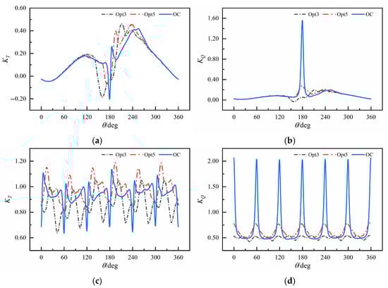 Variation in the hydrodynamics optimization results of the VSP with the revolution angle (J = 2.4): (a) KT of single blade, (b) KQ of single blade, (c) KT of propeller, and (d) KQ of propeller.
