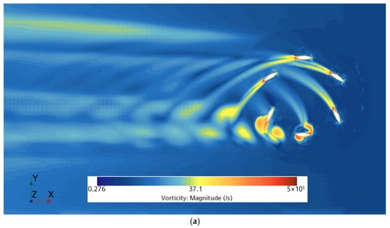 Due to the rapid flipping of the blades near the eccentric point—which involves rapid changes in the peaks of the self-rotation angle and angular velocity—dynamic stall occurs under large angles of attack. This generates flow separation phenomena in the flow field within the revolution angle range of 180–240 degrees. The turbulence intensity is particularly strong under the original curve, as shown in Figure 17c. In contrast, the wake velocity distribution of the optimized VSP is more concentrated, and the intensity of the separation vortices is weakened, as shown in Figure 17a,b. This is beneficial for reducing the hydrodynamic pulsation of the Voith–Schneider Propeller.