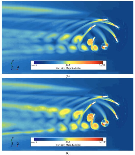 Vorticity distribution under different Blade Steering Curves (J = 2.4): (a) Opt3, (b) Opt5, and (c) OC.