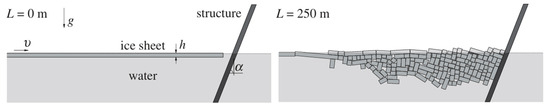 It is worth noting that sloping or conical structures are frequently used in Arctic oil and gas operations. This design is favored because it causes ice to fail in bending, significantly reducing horizontal ice loads on the structure. When an ice sheet encounters a conical or sloped structure, the accumulating pressure eventually causes it to fail by bending, resulting in the formation of numerous ice blocks. Following this failure, these blocks are either forced up the sloped structure or they amass as ice rubble in front of it. This problem is treated numerically [36,37,38].