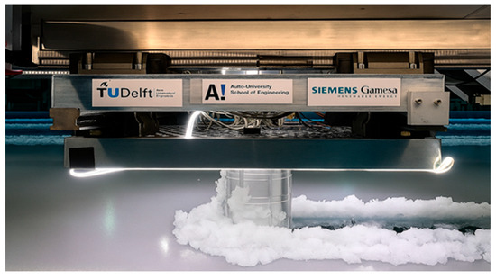 An experimental model test on wave attenuation and dispersion in various ice conditions is conducted in [85], including continuous, fragmented, grease ice, grease pancakes, and wide pancakes (see Figure 4) using a refrigerated wave flume where the wave attenuation and dispersion were measured using ultrasound sensors.