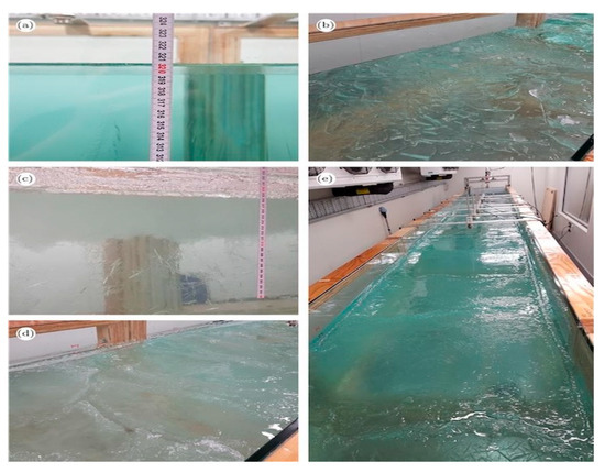 Ice covers test demonstrations: (a) continuous cover, (b) fragmented cover, (c) grease ice, (d) grease pancakes, and (e) wide pancakes [85].