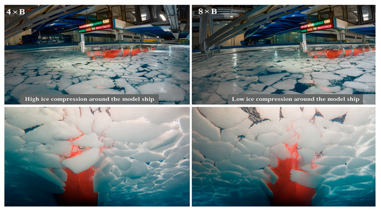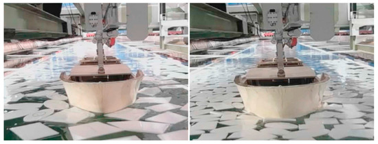 Model tests were conducted in an ice tank to prepare for pack ice conditions [88]. Experiments considered variables such as channel width, broken ice floe size, ice concentration, and ice thickness. Figure 5 depicts a model ship displacing broken ice floes as it navigates through a narrow pack ice channel.