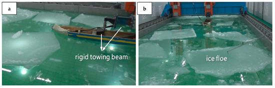 (a) A fixed model ship connected via a towing beam; (b) floating ice floes [89].