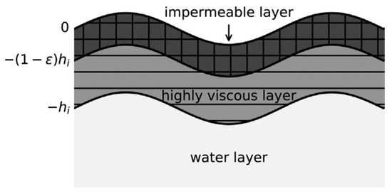 Based on dimensional analysis and considering the inhomogeneous nature of sea ice [92], a two-layer ice model (Figure 9) is presented to explain wave dissipation within the ice. The described model assumed that wave motion exists in only a fraction of the ice thickness, with the rest of the ice being too viscous to permit wave motion.