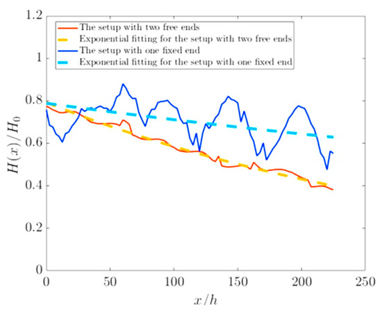 A computational fluid–solid dynamic model is used to solve the Navier–Stokes equations for ocean–wave flow and used the Maxwell viscoelastic model for the solid behavior of ice [94], involving a two-way coupling of fluid and solid dynamics solvers. Figure 10 shows results related to waves with an open-water wavelength. The setup with one fixed end is observed to lead to a lower damping rate, compared with the cover having two free ends.