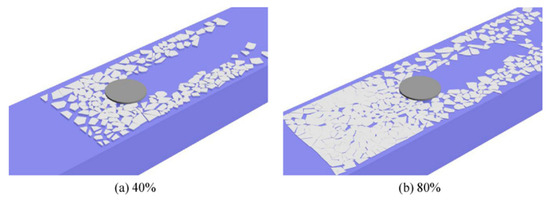 To simulate ice load on floating structures in broken ice, a DEM model is employed in [103] to simulate the broken ice as interacting 3D polyhedral elements, using a dilated contact algorithm for efficient interaction detection. The methodology solves the motion of individual ice floes and the structure based on contact forces, providing a detailed prediction of ice loads by capturing the discrete nature of the ice field. Figure 11 shows that at an 80% ice concentration, ice floes are constrained in front of the structure. However, with a 40% concentration, the greater space allows floes to move around the structure.