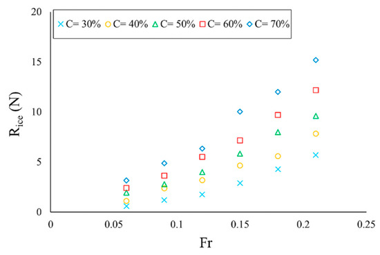 A combined CFD and DEM approach is used to simulate ship–wave–ice interaction [9]. Two algorithms are introduced to implement computational models with natural ice-floe fields, considering floe size distribution and randomness to investigate the influence of ship speed, ice concentration, thickness, and floe diameter. As depicted in Figure 12 (Fr: is the Froude number), ice resistance varies with various ice concentrations. The amount of resistance caused by ice varies depending on the specific circumstances, which is crucial for calculating power requirements and fuel needs.