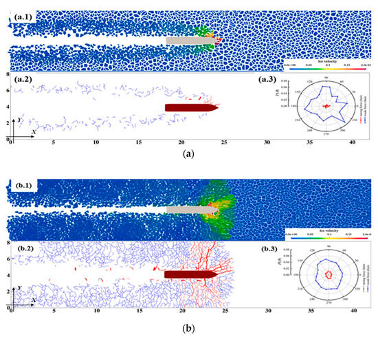 The SPH method simulates the complex process of a ship continuously breaking ice, encompassing initial contact, stress buildup, crack initiation and propagation, ice fragmentation, and the movement of broken ice around the hull. Gui et al. [99] also used SPH to simulate the impact of ice on a ship propeller. The propeller was modeled as a rotating rigid body interacting with ice particles. The ice model included brittle failure under impact. The simulation focused on localized ice damage from propeller impact, including crushing, cracking, and fragmentation. SPH is suitable for this high-deformation, fracture-dominated problem. A propulsion machinery system model was used to simulate the dynamic response of the system during the ice–propeller interaction based on different ice classes, number of propeller blades, propeller shaft length, flexible coupling stiffness, and number of cylinders [116]. A novel method was proposed to predict ice propulsion performance through the use of the alternative interaction coefficient system [117] and the critical issues in ship operation in ice; specifically, the scale effect of icebreaker propellers and the potential for an ice interaction coefficient, were addressed.