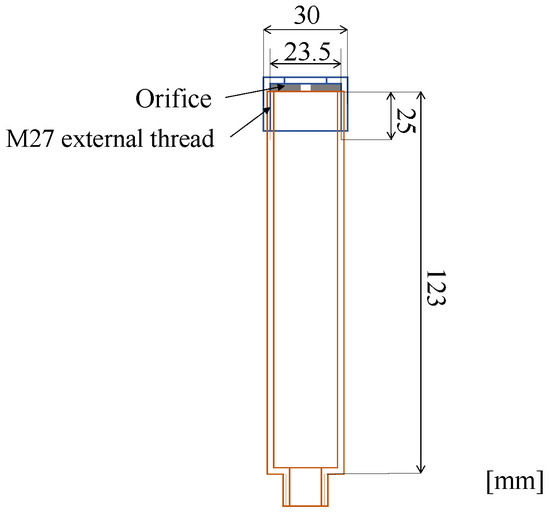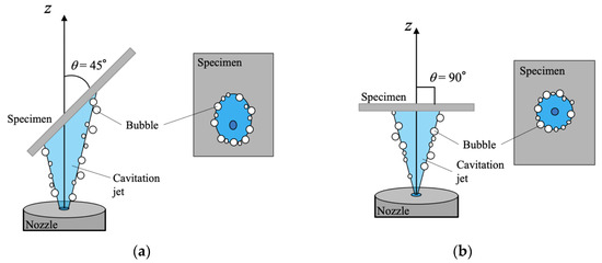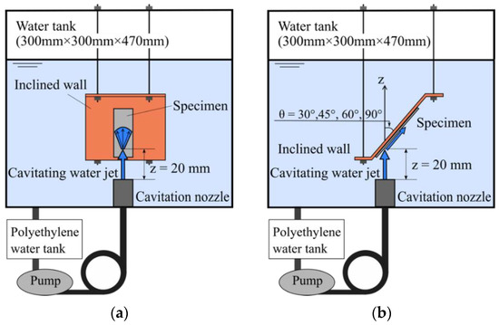 Figure 1 and Figure 2 show a schematic diagram of the experimental apparatus used in this study. A stainless-steel nozzle with a 2 mm thick orifice plate at the tip was installed vertically upward from the bottom center of the acrylic tank. The nozzle was connected to a three-stage plunger-type high-pressure pump with discharge pressures of 8 MPa (AJP-1700VGQ, Ryobi Limited, Japan) and 15 MPa (MF1513P, Flutech Co., Ltd., Japan), measured for the 1 mm orifice diameter. The water pressure and flow rate were controlled by a three-stage plunger-type high-pressure pump (AJP-1700VGQ for 8 MPa and MF1513P for 15 MPa). The discharge pressure was regulated using the pump’s built-in pressure control mechanism. All experiments were conducted after confirming that the system had reached a stable operating condition for at least 30 s. In this experiment, water-based acrylic paint (Water-based spray, Atom House Paints Co., Ltd, Japan) was used as the adhered particulate material. The central axis of the jet was the z-axis, and the inclined wall surface was fixed at several inclination angles with respect to the z-axis. In both experiments, the specimens were exposed to the cavitation jet for 10 min.