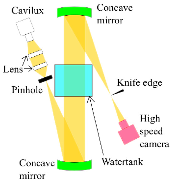 To investigate the generation of shock waves in the jet, visualization observations were carried out. Figure 4 shows a schematic diagram of the optical system used for the visualization observations. Images were taken by the Schlieren method using a laser source (CAVILUX Smart, Cavitar Ltd., Finland) and a high-speed camera (MEMORICAM ACS-1, nac IMAGE TECHNOLOGY, Japan) at 100,000 fps with an exposure time of 10 ns.