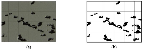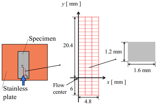 In order to evaluate the difference in the erosion effect due to the difference in the angle of incidence of the cavitation jets, image processing was performed. As shown in Figure 5, the center of the jet on the specimen surface is the origin, the direction of the jet along the surface is the y-axis, and the direction perpendicular to the y-axis is the x-axis. At θ = 30°, 45°, and 60°, the rectangular area in the first quadrant (x × y = 4.8 mm × 20.4 mm) and the rectangular area in the fourth quadrant (x × y = 4.8 mm × 6 mm) of the x-y coordinates are the inspection areas, and at θ = 90°, the rectangular area in the first quadrant (x × y = 1.6 mm × 20.4 mm) and the rectangular area in the fourth quadrant (x × y = 1.6 mm × 6 mm) were the inspection areas. The inspection area was further divided into a micro-area of Δx × Δy = 1.6 mm ×1.2 mm, and the micro-area was magnified using a digital microscope (VH-5500, KEYENCE Corporation, Japan). As shown in Figure 6, the images before and after the experiment were binarized, and the erosion area ratio of the specimen surface was calculated as an index of the erosion effect using the following equation: