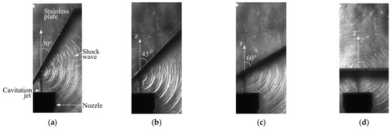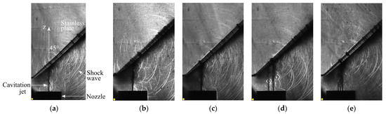 In Figure 7d, a large number of shock wave surfaces can be observed behind the wall surface where the jets are impinging, whereas they are hardly observed in Figure 7a–c. The wall material used in these experiments was acrylic in Figure 7d, while that used in Figure 7a–c was stainless-steel plates. The impact impedance of each material is about 44 × 106 Ns/m3 for the stainless-steel material and 3.3 × 106 Ns/m3 for the acrylic material, while that of water is about 1.5 × 106 Ns/m3. Therefore, since the order of impact impedance of the acrylic material and water is equal and their values are closer than those of the stainless-steel material, the shock waves are almost reflected by the stainless-steel wall in Figure 7a–c, while the acrylic material in Figure 7d is considered to transmit the shock waves.