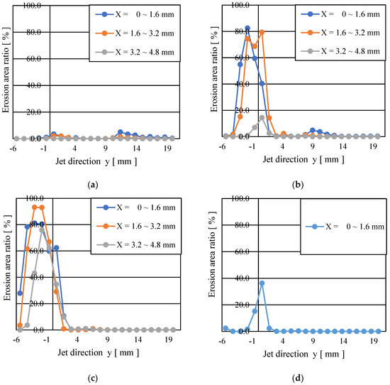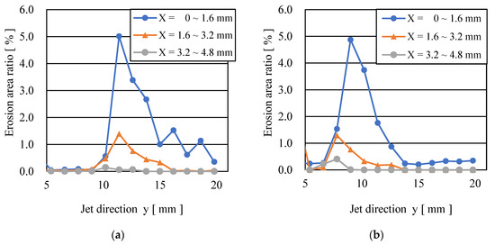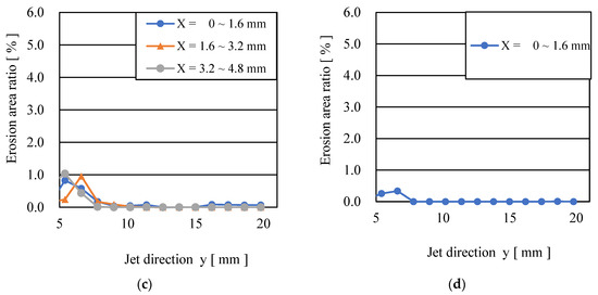 Figure 8a–d show the distribution of the area fraction of erosion in the y direction for three different values of x for θ = 30°, 45°, 60°, and 90°, respectively. Figure 9 is an enlarged version of the graph between y = 5 and 20 mm in Figure 8. Around the origin, the area is about 3.5% at θ = 30°, about 80% at θ = 45°, about 90% at θ = 60°, and about 90% at θ = 90°. At θ = 90°, about 35% erosion occurred. Since the erosion that occurred near the origin is mostly caused by the water hammer effect due to the direct impact of the jet, the effect of microjets generated by the bubbling motion cannot be clarified. But after y = 8 mm at θ = 30° and 45°, the erosion at θ = 60° and around y = 6 mm at 90° might be caused by shock waves and microjets generated by bubble motion because the jet flows along the wall surface and the water hammer effect is small. In addition, the erosion area tends to change in a negative direction as the angle increases from θ = 30° to 45° to 60°. The bubbles flowing to the left of the central axis of the jet were stationary in this experiment and the number density of bubbles increased, as seen in the shadow of the bubble cloud in Figure 7. The extent of erosion outside of the origin area was y = 10 to 20 mm at θ = 30°, y = 8 to 12 mm at θ = 45°, and y = 5 to 6 mm at θ = 60°, and the difference was y = 5–6 mm. The smaller the inclination angle, the smaller the water hammer effect of the jet impacting the specimen, and the weaker the ambient pressure fluctuation that causes bubble motion; in addition, the faster the flow velocity past the specimen surface, the more bubbles that started to move were swept downstream. The bubbles that initiated the motion were swept further downstream. At θ = 90°, the water hammer action is maximum, and the bubble motion is considered to occur violently in a short time. In addition, since the jet diffuses concentrically around the origin, the number density of bubbles decreases, and the erosive effect is concentrated near the origin where the jet impacts, and it is easily expected that there is almost no effect in the region outside the center. It is easily predicted that the erosion effect is concentrated in the vicinity of the origin where the jets collide, with almost no effect in areas outside the center.