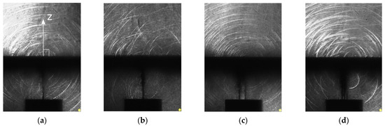 Image of erosion test for θ = 90°: (a) Type No. 1; (b) Type No. 2; (c) Type No. 3; (d) Type No. 4.