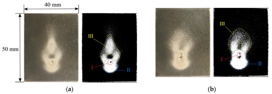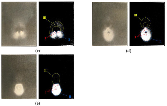 Figure 12 shows the results of erosion experiments at each orifice under the condition of θ = 45°. The flow direction of the jet is from bottom to top. The right image is a binarized version of the left image to clarify the extent of erosion. In each condition, Area I is the area where the main stream of the jet stream directly impacted the specimen. In particular, in Figure 12a, the specimen was scraped into a concave shape, and in Figure 12b, a through-hole was formed in the aluminum plate. Erosion occurred in Area II, which is the upstream region including the jet impact area. The erosion area was 8.4 mm long and 14.7 mm wide in Figure 12a, 9.6 mm long and 14.1 mm wide in Figure 12b, 8.3 mm long and 16.5 wide in Figure 12c, 8.1 mm long and 12.3 mm wide in Figure 12d, and 7.3 mm long and 10.9 mm wide in Figure 12e. In Figure 12c,d, the effect of erosion in the two-hole orifice is significantly enhanced due to the direct interference of the jet in Figure 12d. The erosion in Area III extends to the left and right after the jet impact, and there is a region where no erosion occurs until the jets flow 3.6 mm in Figure 12a, 4.4 mm in Figure 12b, 4.4 mm in Figure 12c, and 5.9 mm in Figure 12d. In Figure 12e, no clear erosion occurred in the region downstream of the impact zone.