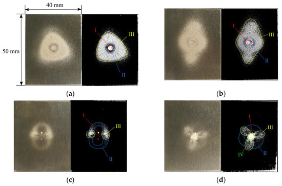 Figure 13 shows the experimental results of erosion at each orifice under the condition θ = 90°. Area I in Figure 13a is the area where the main flow of the jet directly impacted the orifice and produced a circular erosion with a diameter of 3.8 mm. In Area II, no erosion occurred within 1.8 mm radially from Area I. In Area III, erosion occurred again within a maximum radial distance of 16.5 mm from Area I. In Figure 13b, Area I was directly impacted by the main jet stream, and elliptical erosion with a long diameter of 4.6 mm and a short diameter of 3.0 mm occurred. Area II was slightly eroded. In Figure 13c, Area I was directly impacted by the main jet stream, and circular erosion with a diameter of 1.2 mm was observed. The erosion in Area II was not clearly visible. On the other hand, in Area III, erosion occurred up to 8.1 mm away from Area I. Area I in Figure 13d, where the two jets directly collided, exhibited circular erosion with a diameter of 1.2 mm. The erosion in Area II did not clearly appear. In Area III, an elliptical ring of erosion occurred up to 8.4 mm from Area IV, suggesting that the two jets interfered, resulting in more severe erosion than in Area II. In Area IV, three jets interfered with each other, suggesting that the erosion was more severe than in Area III.