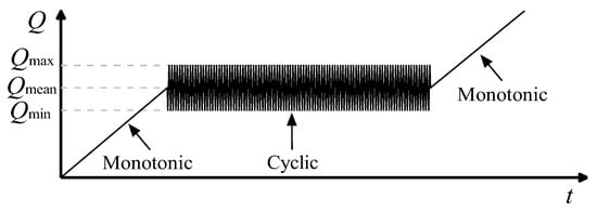 This study focuses on investigating the influence of plate parameters on the cyclic bearing behavior of helical piles. The cyclic load versus time curve [,] is presented in Figure 2. Typically, cyclic loading is applied after the installation of the helical pile. The process begins with the application of a preload, represented by the average cyclic load Qmean, to simulate the historical loading experienced by the pile. This is followed by the application of cyclic loading, where Qcyclic denotes the load amplitude, Qmax represents the maximum load, and Qmin denotes the minimum load. Finally, a monotonic pullout test is performed. The key influencing parameters include Qmean, Qcyclic, the number of loading cycles Nf, and the loading frequency f. Considering that the safety factor under static load conditions is typically greater than or equal to 2, and that this study focuses on plate parameters while excluding extreme conditions, the cyclic load amplitude is relatively small, with the wave cyclic period generally ranging from 8 to 10 s. Therefore, the cyclic loading parameters are defined as follows: Qmean/Qu = 0.4, Qcyclic/Qu = 0.1, Nf = 100, and f = 0.1 Hz. Each pile configuration is subjected to both monotonic loading (M) and cyclic loading (C). The purpose of monotonic loading is to determine the ultimate bearing capacity, Qu.