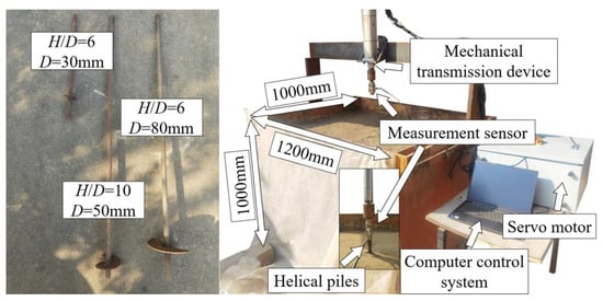 Sakai et al. [] conducted pullout physical modeling tests on helical piles using a cylindrical sandbox with a diameter of 4D, placing the helical plate directly on the bottom surface of the box. This setup did not produce significant boundary effects. Additionally, Shi et al. [,] performed physical modeling tests in a rectangular box with a width of 12D, where the bottom of the plate was positioned 1.5D above the base of the box. Their results confirmed that the tests were not influenced by boundary effects, as the maximum extension of the soil’s shear strain field beneath the plate was less than 1D. Based on these findings, a rectangular sandbox with dimensions of 1200 × 1000 × 1000 mm (length × width × depth) is used in the present study, as shown in Figure 3. The width of the box is 12.5 times the maximum plate diameter (D = 80 mm), and the distance between the bottom of the plate and the bottom of the sandbox exceeds 3D.