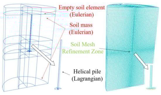 Numerical simulations were performed using the Coupled Eulerian–Lagrangian (CEL) approach in the finite element software []. Owing to the symmetry of the soil, helical pile, and loading conditions, a half-model was adopted for the analysis. For the selection of soil boundaries, similar numerical models were referenced for the boundary setup [,,], and boundary effect calculations were conducted. When the horizontal extent of the soil domain was set to 10D, and the model thickness was defined as 2H, it was assumed that the numerical model would experience negligible boundary effects.